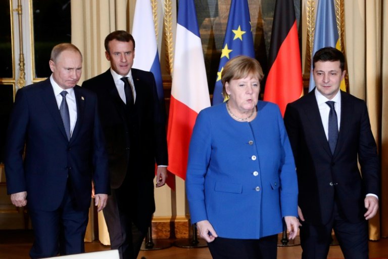 POOL / AFP / Thibault CamusLe président russe Vladimir Poutine, le président français Emmanuel Macron, la chancelière allemande Angela Merkel et le président ukrainien Volodymyr Zelensky devaient donner une conférence de presse conjointeLe leader russe Vladimir Poutine a rencontré lundi son homologue ukrainien Volodymyr Zelensky pour la première fois, lors d’un sommet à Paris visant à convenir de mesures pour mettre fin à cinq ans de conflit dans l’est de l’Ukraine.