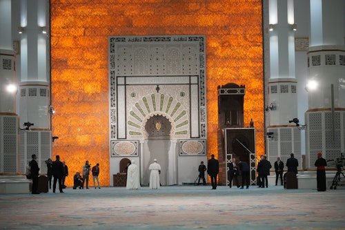 L’après-midi, le pape a visité la Grande Mosquée, au plus haut minaret du monde (267 mètres). « Notre rencontre est la preuve que nous pouvons apprendre à nous respecter mutuellement, à vivre en harmonie et à construire un monde de paix », a déclaré le souverain pontife aux côtés du recteur de la Grande mosquée, le Cheikh Mohamed El-Mamoune El-Kacemi El-Hassani.
