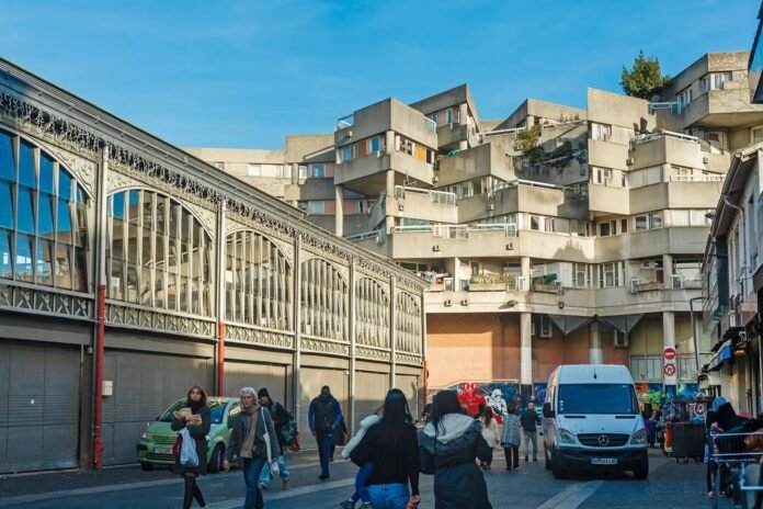 Tout paraît si calme, en cette radieuse après-midi de la fin d’avril. En plein cœur du centre historique de Saint-Denis (Seine-Saint-Denis), sur la dalle en béton de l’îlot 8, comme suspendue dans les airs, une petite fille passe à patins à roulettes, un jeune homme assis au soleil consulte son téléphone et trois étudiants en architecture portugais lèvent le nez vers les volumes insensés et les terrasses-jardins imaginés par l’architecte Renée Gailhoustet (1929-2023). Mais ce calme apparent cache une bataille urbaine de dix ans, menée par les habitants et un collectif d’architectes et d’urbanistes pour sauver cet ensemble emblématique d’une certaine idée de la ville et de la notion de « communs ». Une bataille peut-être en passe d’être gagnée, depuis que le candidat de La France insoumise (LFI), Bally Bagayoko, s’est imposé à la tête de la ville lors des dernières élections municipales.