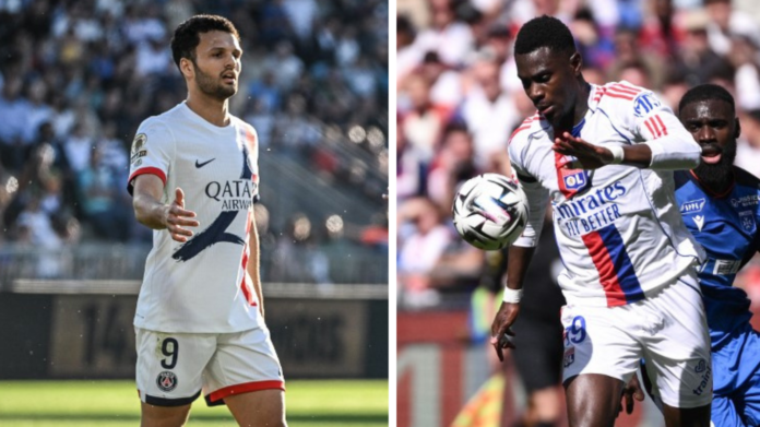 Le Parisien Gonçalo Ramos et le Lyonnais Moussa Niakhaté, lors de la 31e journée de Ligue 1, le 25 avril 2026. (AFP)