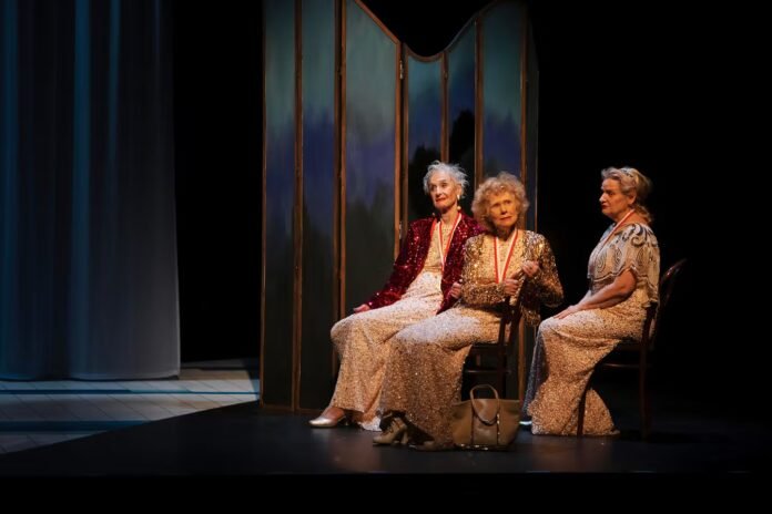 Sur l’étroite scène du Studio Hébertot, à Paris, drapée d’un haut voilage blanc et recouverte d’un faux carrelage de piscine, débarquant, l’une de Buenos Aires, la deuxième de New York, la dernière de Tel-Aviv, les sportives se retrouvent et leurs souvenirs affluent, par éclats et fragments, tandis que leur hôte, un serviteur aux cheveux gominés portant une livrée serrée (Nicolas Struve) sert le champagne à la demande.